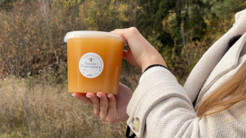 "У руках в мене мед — акація різнотрав’я. Цей мед викачується орієнтовно у червні-липні. Цього року він такий жовтуватий трішечки, але дуже смачний. Він майже не кристалізується, тобто, такий дуже кремоподібний і ніжненький", — каже Вікторія.