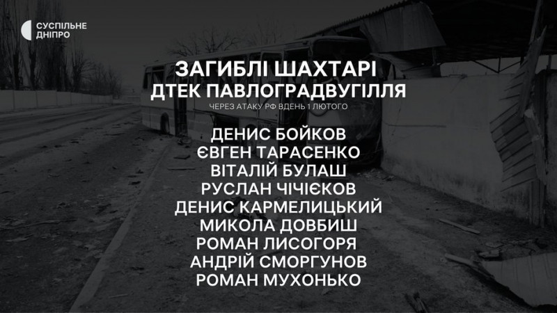 1 лютого армія РФ ударила "шахедами" по автобусу з шахтарями ДТЕК у Тернівці, що в Павлоградському районі Дніпропетровщині. Загинули щонайменше 12 людей, серед них дев’ятеро — гірники. Також є поранені.