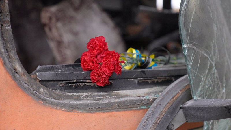 Жителі залишають квіти в автобусі, понівеченому після атаки РФ. Суспільне Дніпро