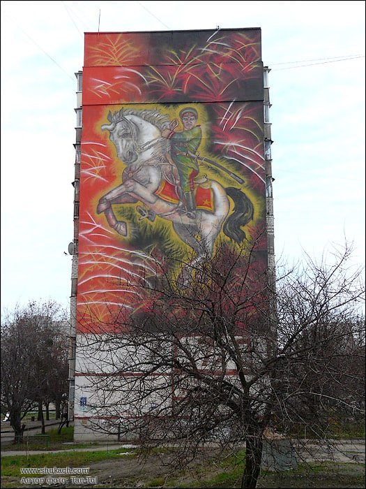 Зокрема, у Харкові досі існують два мурали, на яких зображені радянський маршал Георгій Жуков і радянський космонавт Юрій Гагарін.