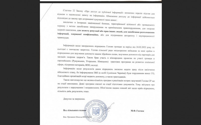 У Боянській сільській громаді у відповіді на запит відповіли, що інформація про відрядження голови громади Аурела Бабія "тимчасово закрита в період воєнного стану".