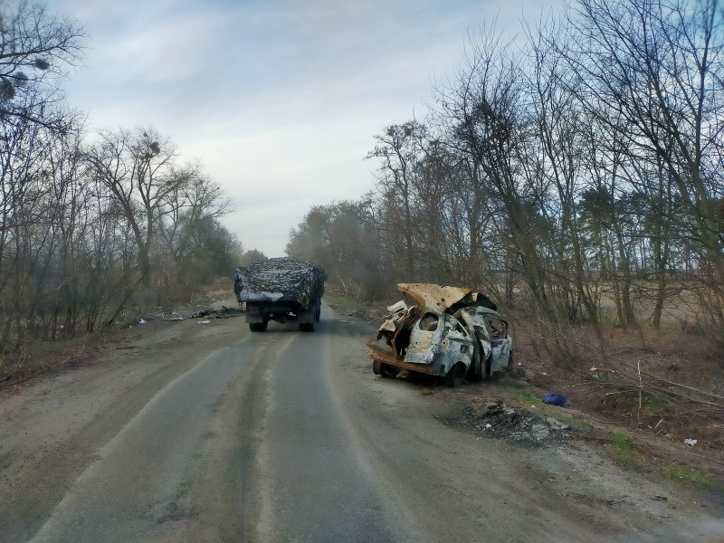 "У місті на Рівненщині був приліт балістики. Слава Богу, всі встигли заскочити в окопи. Тоді ж ми збили безпілотника — це був перший такий бойовий досвід. Потім Житомирщина. Вся траса, все горіло: бронетехніка, БТРи, літали винищувачі. Як у бойовиках усе було".