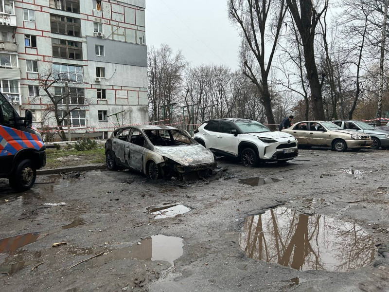 "Скло вибило, заклинило капот і багажник, але це все можна відремонтувати. Я чув близько 30 вибухів. А біля нас, то годині о 23-й, потужний вибух був. Кажуть, дрон на дерево впав. Світла в нас не було. Я на вулицю, коли вийшов, — рятувальники гасили одну з автівок, вона почала вибухати. Нас ДСНС відігнала від будинку, бо був сильний запах газу. У нас поранених немає тут", — пригадав він.