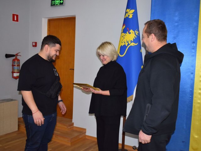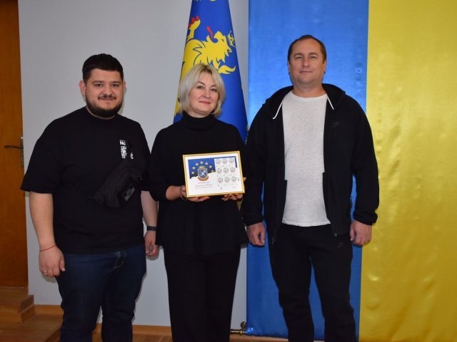 Також очільник вручив пані Олені Здор марку, приурочену Міжнародному альянсу за мир і єдність у Європі, у який теж входить Василівська районна рада.