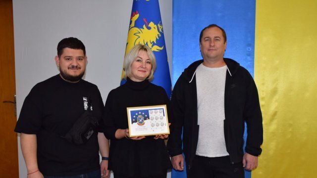 Також очільник вручив пані Олені Здор марку, приурочену Міжнародному альянсу за мир і єдність у Європі, у який теж входить Василівська районна рада.