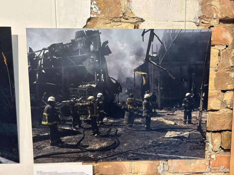 Інша частина експозиції показує наслідки обстрілів та роботу рятувальників, які ліквідовують пожежі після російських атак.