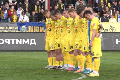 Гравці ФК “Буковина” під час хвилини мовчання перед грою. Суспільне Чернівці