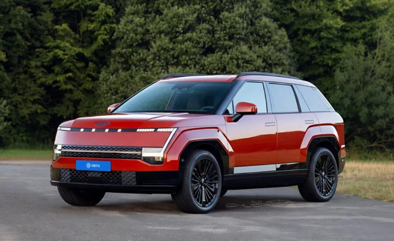У профіль кросовер нагадуватиме Hyundai Santa Fe з квадратними колісними арками та прихованими дверними ручками. Ззаду прогнозують суцільну LED-панель із тонкими ліхтарями.