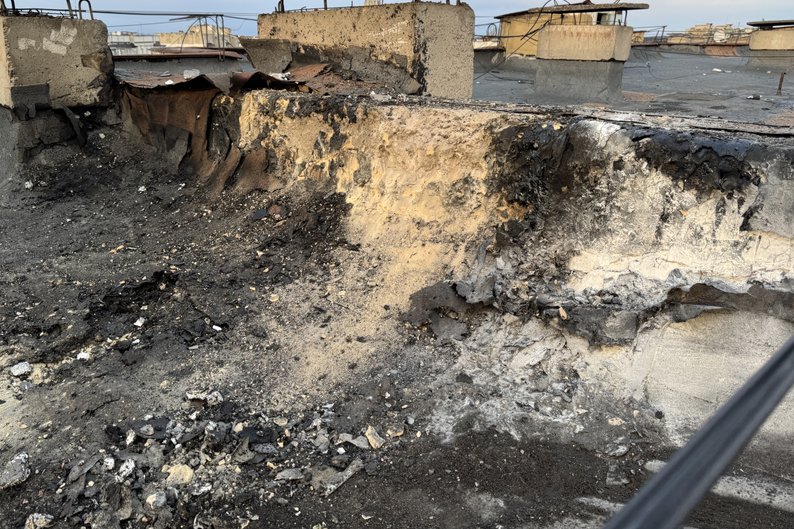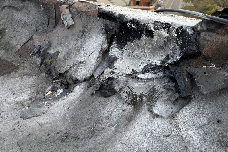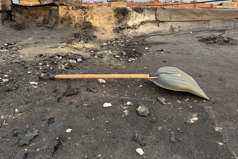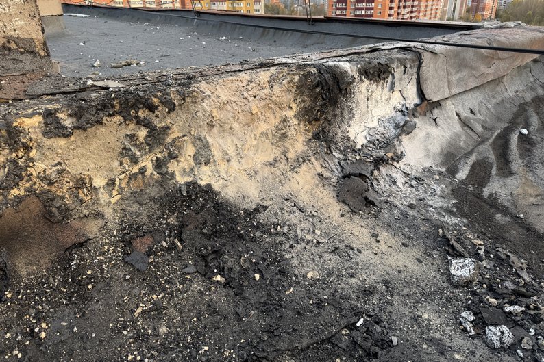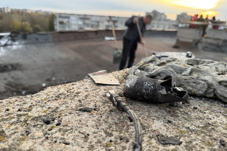 На даху багатоповерхівки ремонтники ладнали пошкоджений інтернет-кабель. Прибирав будівельне сміття поряд із місцем влучання і директор компанії-управителя, що обслуговує цей будинок, Володимир Дмитрук.