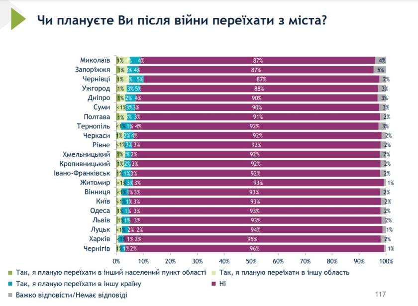 За результатами опитування, 86% харків’ян відповіли, що однозначно відчувають таку гордість. Відповідь «скоріше так» надали 10% опитуваних. Два відсотки та один відсоток респондентів обрали варіанти — «скоріше, ні» та «однозначно, ні» відповідно. Ще одному відсотку жителів Харкова було важко відповісти на це питання або вони взагалі не мали відповіді. У порівнянні з 2020 роком відсоток тих, хто пишається тим, що є харків’янином збільшився. Крім того, 95% опитуваних харків’ян сказали, що не планують після війни переїжджати з міста.