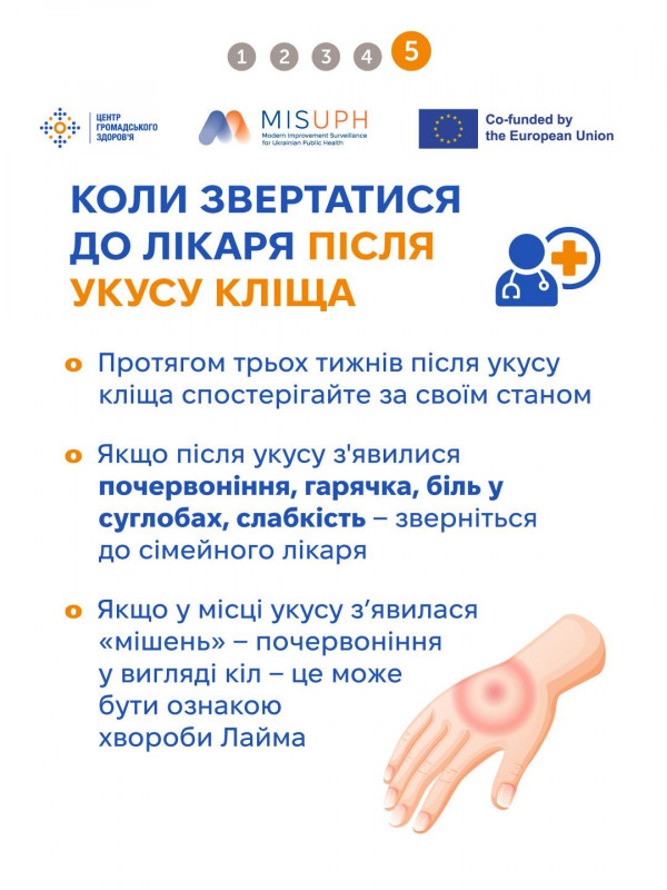 Хвороба Лайма може починатися з почервоніння на місці укусу кліща, схоже на мішень (червоні кола), головного болю, млявості, болю в тілі. Якщо її не лікувати на ранній стадії — це може призвести до ураження шкіри, суглобів, серця, нервової системи й навіть до інвалідності.