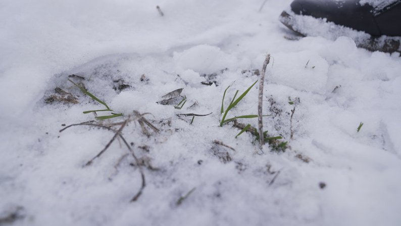 Перевірка висоти снігового покриву озимини. Суспільне Вінниця"Кожна сонячна година була на вагу золота. Є рослини, які встигли з осені розкуситися. І в цілому, якщо говорити по області, десь таких посів у нас до 45. І є посіви, які знаходяться в фазі від 1 до 3 листочків. Це знову ж таки відсотків 40", — сказав науковець.
