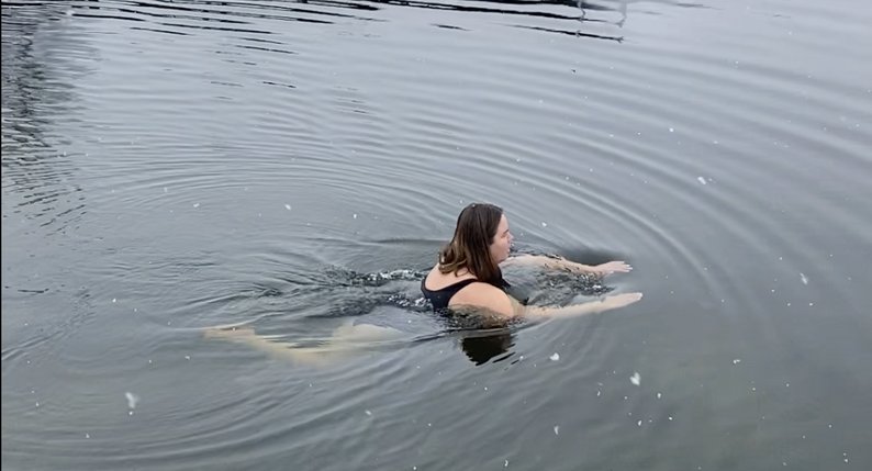 Катерина Бойко в озері Світязь, грудень 2025 року. Суспільне Луцьк"Почала купатися в січні, купалася поступово. Я собі зразу пішла в ополонку окунатися, бо мені було так комфортно. Я відчувала, що мені так добре", — каже Катерина.