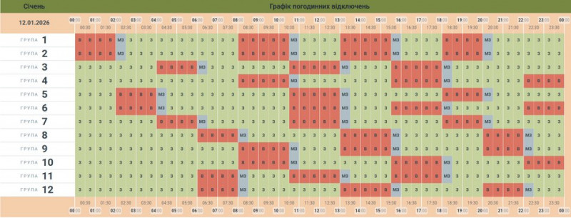 Графік погодинних відключень електрики на 12 січня. АТ «Чернівціобленерго»