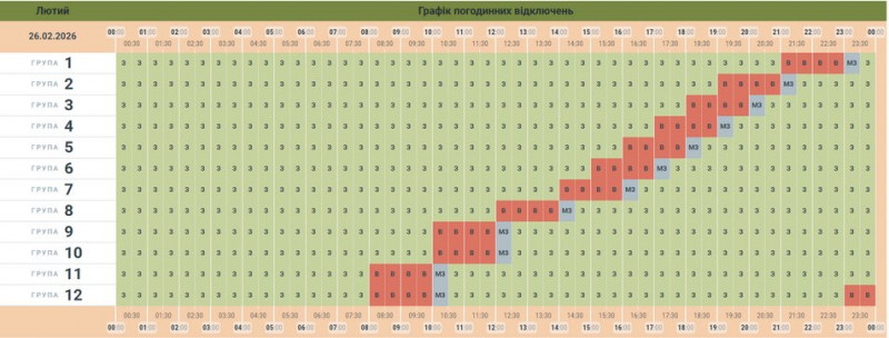 Графік погодинних відключень електрики на 26 лютого. АТ “Чернівціобленерго”