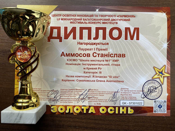 Юний криворізький музикант здобув 1 премію в номінації “Інструментальний, гітара”.