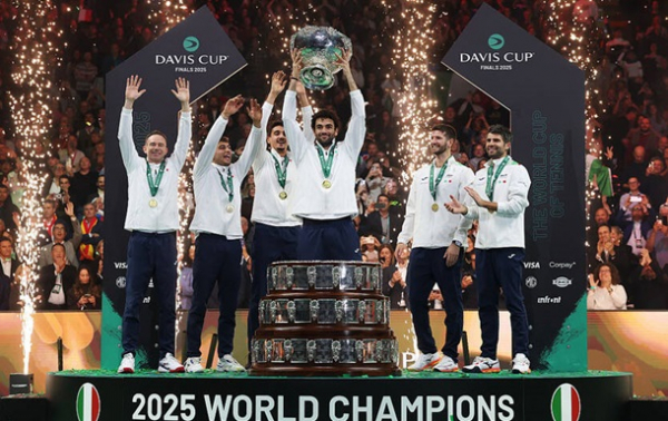 Італійська чоловіча збірна з тенісу завершила турнір Кубок Девіса 2025 року у статусі переможців. У фіналі італійські спортсмени обіграли іспанців із рахунком 2:0 за підсумками двох зіграних матчів. Спочатку у двох сетах здобув перемогу Маттео Берреттіні, який перевершив Пабло Карреньо Бусту — 6:3, 6:4. А Флавіо Коболлі на тенісному корті був сильніший за Хауме Мунара — 1:6, 7:6(5), 7:5. Кубок Девіса Фінал Італія — Іспанія — 2:0 Маттео Берреттіні — Пабло Карреньо Буста — 6:3, 6:4 Флавіо Коболлі — Хауме Мунар — 1:6, 7:6(5), 7:5 Для Італії здобутий титул володарів Кубка Девіса став третім поспіль і четвертим загалом. До цього італійці перемагали в 1976 році, а також у 2023 і 2024 роках. Водночас італійська збірна є першою командою з 1972 року, що виграла турнір тричі поспіль. Тенісна збірна України посіла восьме місце, втративши три позиції