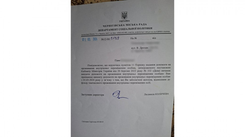 Повідомлення про припинення виплат ВПО, які отримали люди після заселення в модульне містечко. Суспільне Чернігів"Вони так по закону можуть робити, що вдієш. Он у Новоселівці люди отримують виплати: місцева влада взяла на себе ці витрати. У нас вирішили, що нам не треба, бо нам дали тимчасове житло", – говорить Валентина.