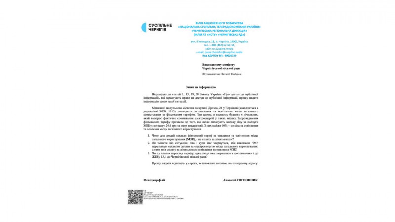 Відповідь на запит Суспільного. Суспільне Чернігів