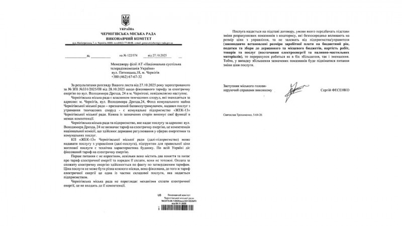 Також у відповіді зауважили, що Чернігівська міська рада та підприємство, яке надає послугу в модульному містечку на Дрозда не визначає тариф на електричну енергію, це компетенція НКРЕКП. Хоча питання в запиті було не про тариф на електроенергію як такий, а про те, чому в платіжках за послуги ЖЕКу є фіксований (однаковий для квартир у всіх будинках, влітку та взимку) тариф на освітлення та опалення місць загального користування, якщо для цих місць є окремі лічильники в кожному будинку.