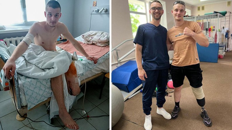 Владислав Білецький після операції (ліворуч) та на реабілітації (праворуч). Тернопіль, 2023 рік. Владислав Білецький