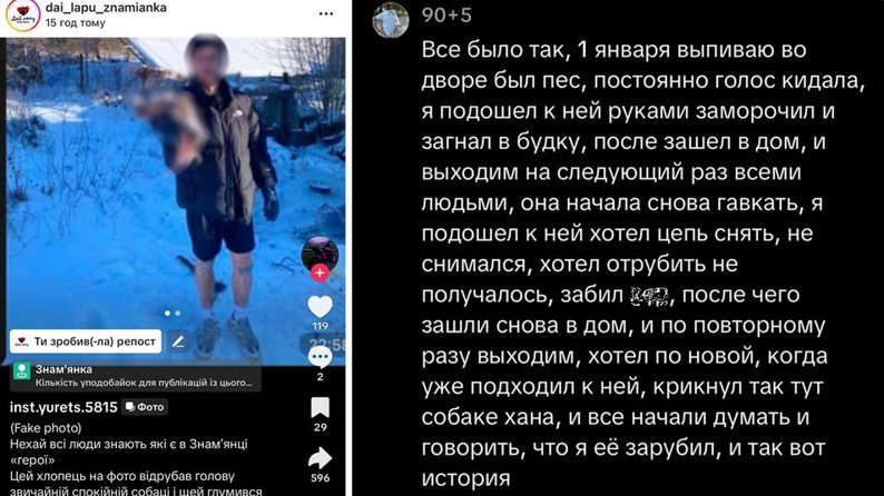 Чоловік виклав фотографію з головою собаки в соціальну мережу Instagram. Після цього скриншот світлини опублікували інші люди в мережі TikTok з підписом "Нехай всі люди знають, які в Знам'янці є "герої". У відповіді на звинувачення в коментарях автор фотографії розмістив коментар, де написав (переклад з російської Суспільного):