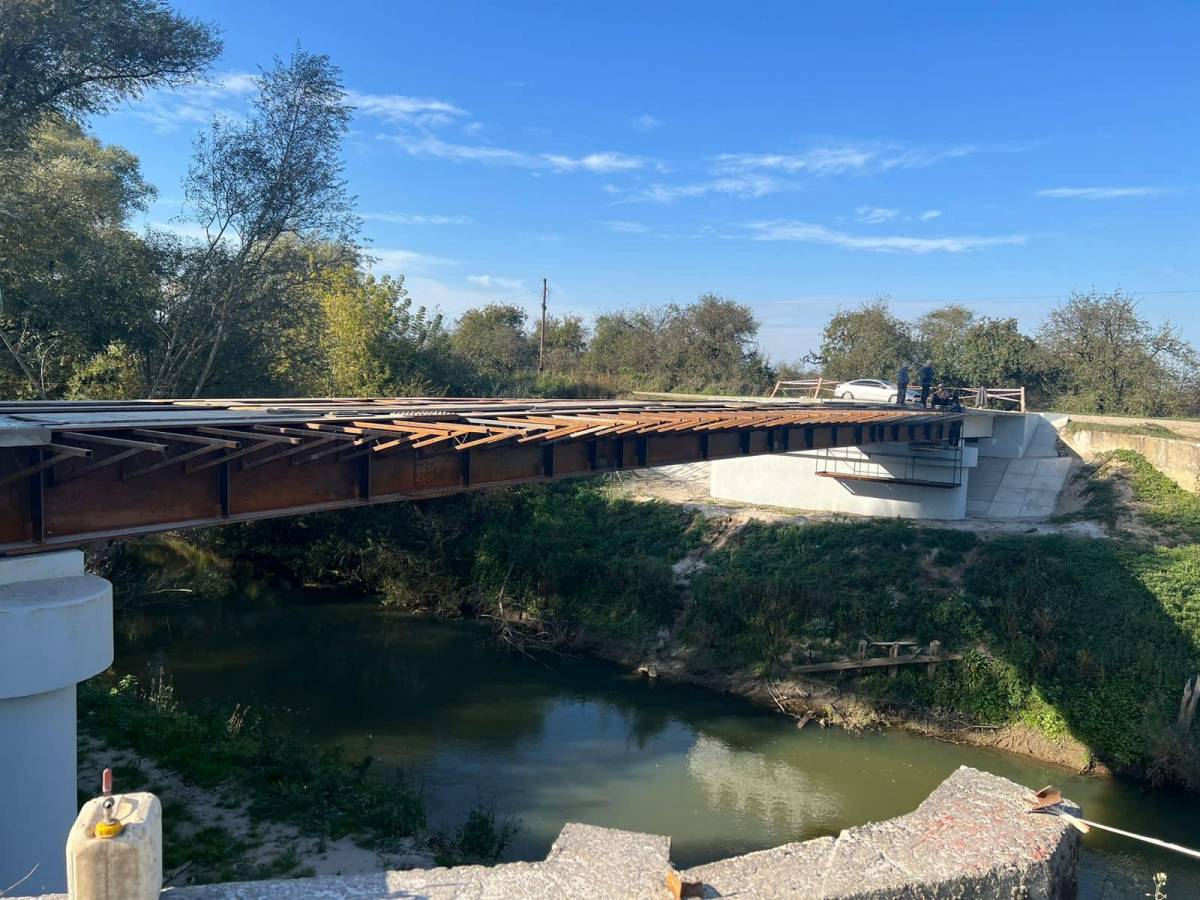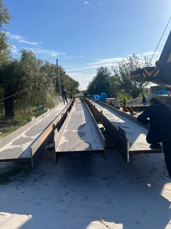 На сьогодні (13 жовтня) виконано роботи із битонування конусів мосту, шпаклювання та фарбування опор, зварювання металевих балок та влаштовано 4 балки з 8.