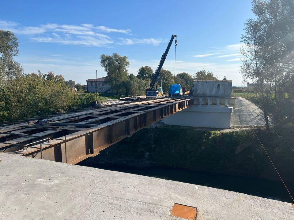 На сьогодні (13 жовтня) виконано роботи із битонування конусів мосту, шпаклювання та фарбування опор, зварювання металевих балок та влаштовано 4 балки з 8.