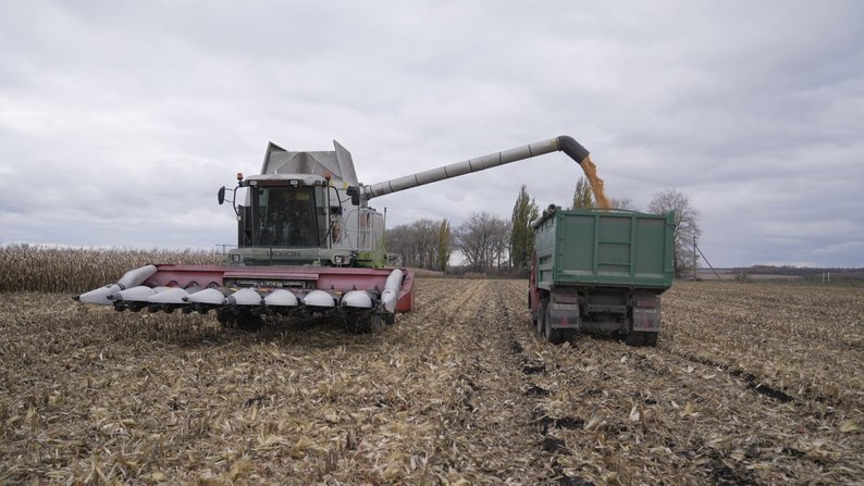 Комбайн висипає кукурудзу у вантажівку. Суспільне Вінниця