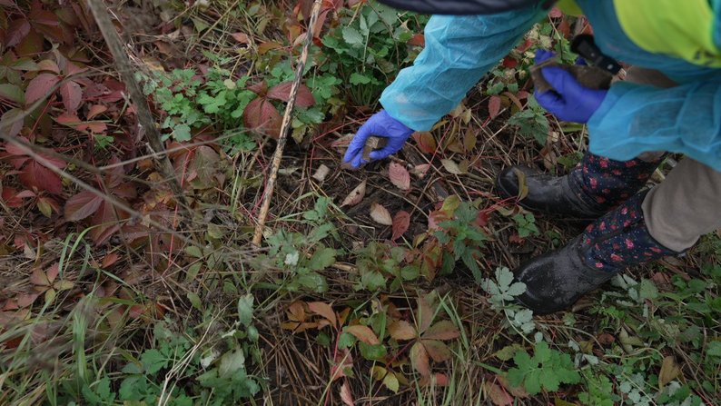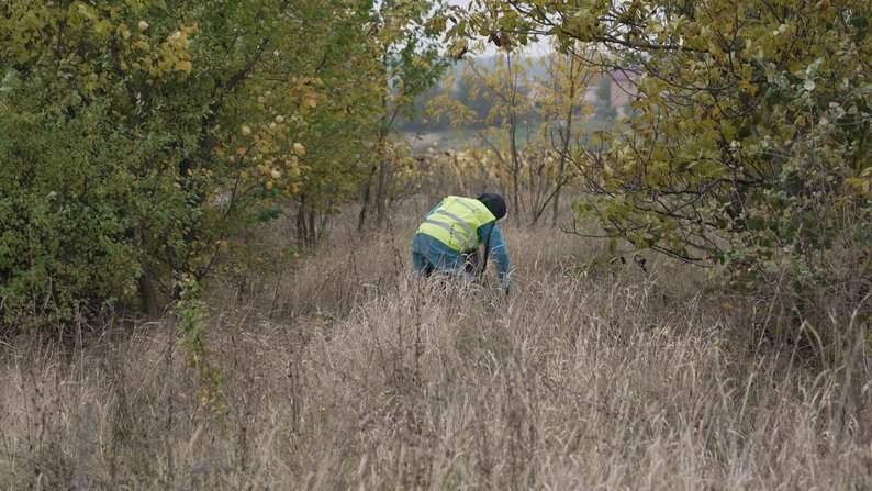 Жінка розкладає приманки для тварин у траві. Суспільне Вінниця