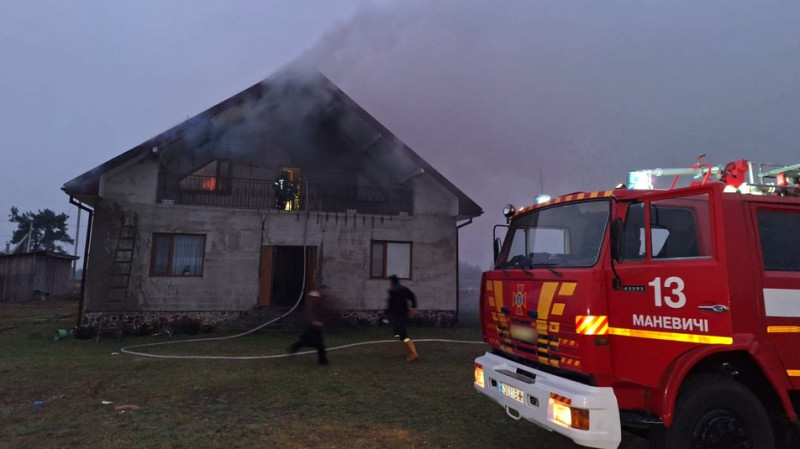 У селі Комарове Маневицької громади зранку 23 жовтня спалахнув двоповерховий житловий будинок. Господиня помітила дим, швидко вивела з оселі двох дітей і викликала рятувальників.