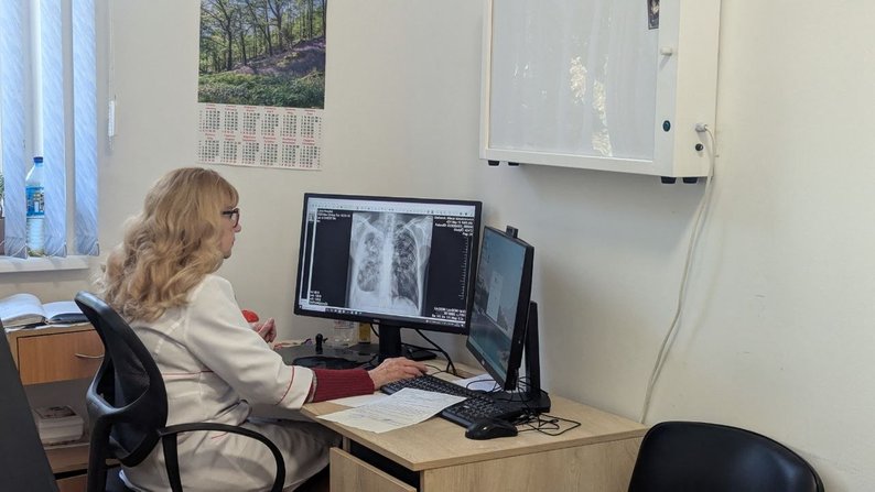Валентина Мостова працює завідувачкою рентгенологічного відділення майже 40 років. Показує на екрані комп’ютера знімки, зокрема запущену форму туберкульозу одного з пацієнтів, який перебуває на лікуванні в стаціонарі. Як правило, з її слів, у пацієнтів виявляють малі форми туберкульозу – вогнищевийВогнищевий туберкульоз легень — це початкова форма вторинного туберкульозу, що характеризується утворенням невеликих вогнищ (до 10 мм) у верхніх відділах легень (1-2 сегменти). Хвороба часто перебігає малосимптомно, проявляючись незначним кашлем, субфебрильною температурою, нічною пітливістю та втомою., невеликий інфільтративнийІнфільтративний туберкульоз легень — це одна з найпоширеніших форм легеневого туберкульозу. Простіше кажучи — в легенях утворюється ділянка запалення, яка має схильність до руйнування тканини. Цей процес зазвичай починається безсимптомно. Тому його й складно «впіймати» вчасно., однак є і великі форми, лікування яких триваліше.
