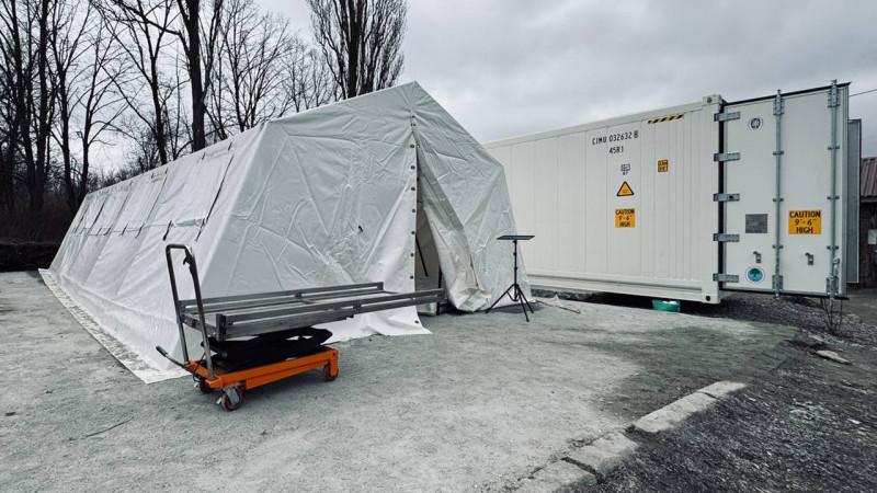 Намет, в якому працюють судові експерти й поліцейські, та контейнер з холодильним обладнанням для зберігання тіл. Кропивницький, квітень 2026 року. Суспільне Кропивницький
