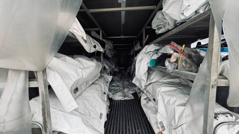 Пакети з тілами в контейнері з холодильним обладнанням. Кропивницький, квітень 2026 року. Суспільне Кропивницький