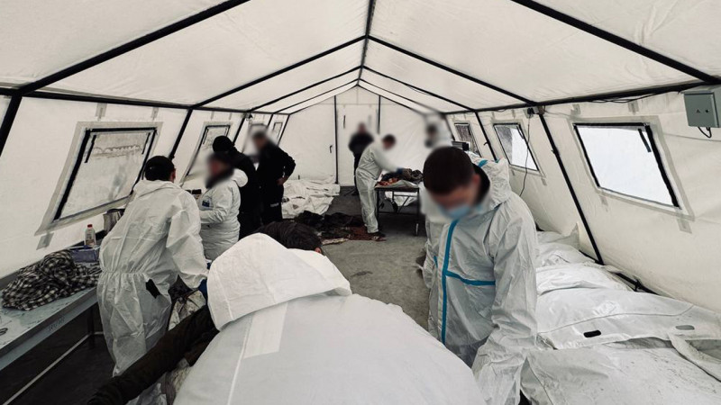 Судові експерти й поліцейські працюють у спеціальному наметі: оглядають тіла загиблих, одяг, особисті речі, які повернули в Україну з Росії під час торішніх обмінів. Це частина роботи з ідентифікації загиблих, сказав Володимир Шилан.