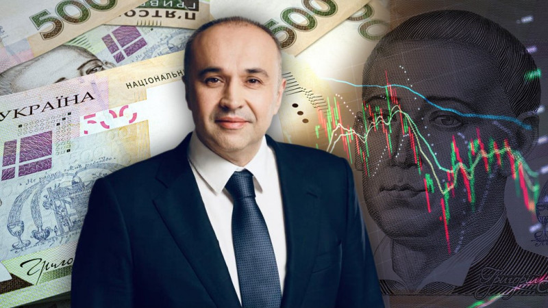 Колаж із зображенням Бориса Приходька на фоні грошей та графіків. Getty Images