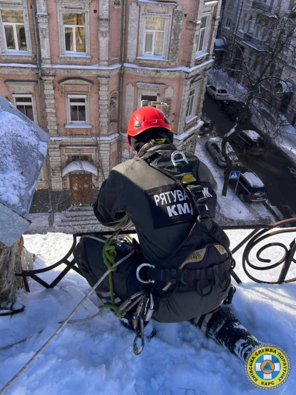 Рятувальники комунальної аварійно-рятувальної служби (КАРС) «Київська служба порятунку» прибрали нависаючі небезпечні бурульки за допомогою спецобладнання та висотного спорядження на будинку у Шевченківському району міста.