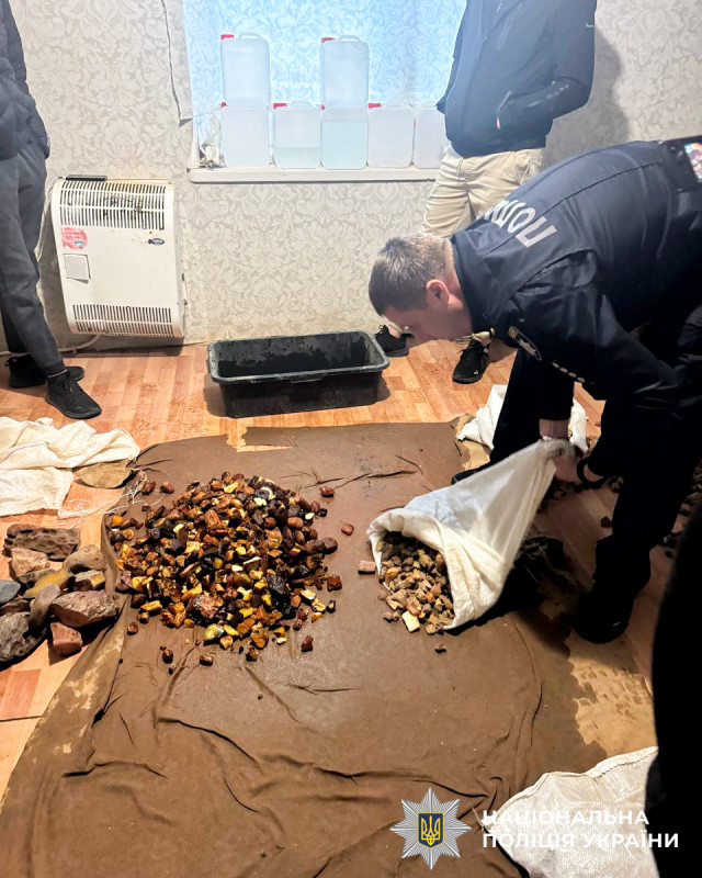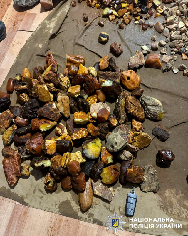 Як зазначили у поліції, у межах відкритого кримінального провадження про незаконне видобування та збут бурштину поліцейські провели обшуки, під час яких вилучили понад 80 кілограмів каміння, знаряддя для його обробки, електронні ваги, мобільні телефони та автівку. Вартість виявленого бурштину за цінами "чорного" ринку становить приблизно два мільйони гривень.