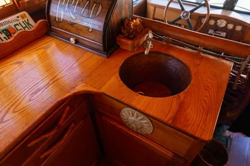 Дім на колесах збудований на шасі вантажівки Chevrolet 1928 року. Його житловий модуль повністю виконаний із дуба та має 21 вікно з вітражами.