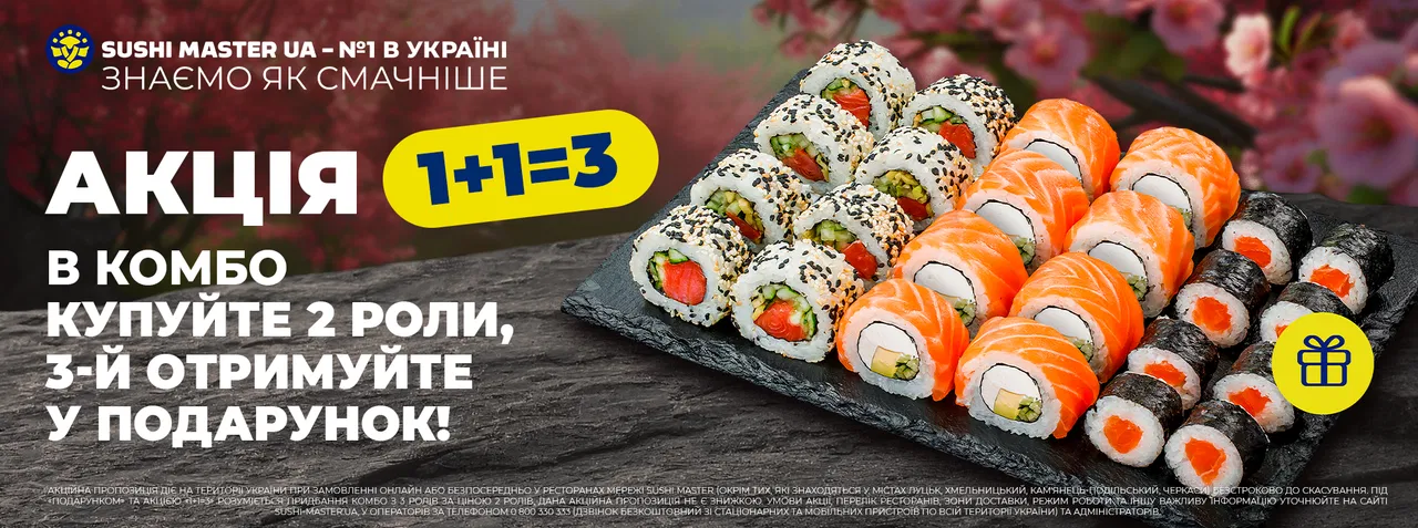 У сезонному списку акцій від Суші Майстер представлені позиції, які добре знайомі шанувальникам японської кухні та регулярно привертають увагу покупців. До них належать Комбо “Філадельфія Мікс” – 25%, Комбо “Мега Фіш” – 19%, Комбо “Три легенди” – 21%, “Філадельфія” з лососем – 18%, Сет Гурман – 26%, Сет Лососевий Бум – 14%, Сет Весняний – 34%, Сет Тижня – 32%, Сет Фантастична трійка – 19%, Сет Двоє в Кіото – 34%.