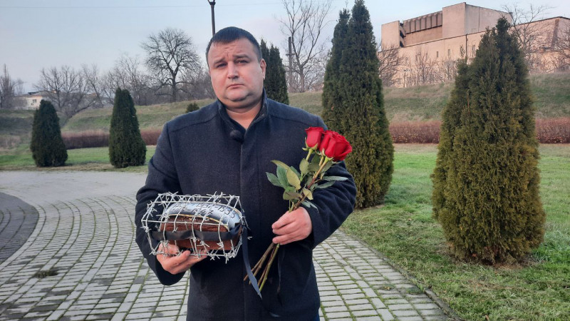 Кропивничанин Геннадій Шевченко приніс буханець хліба, обмотаний дротом. Суспільне Кропивницький