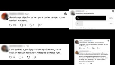 Думки користувачів соцмереж щодо легалізації зброї для цивільних в Україні. Скриншоти з Threads
