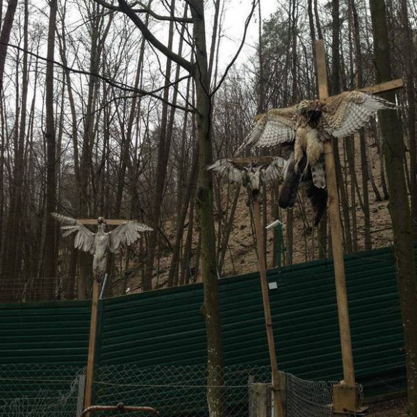 Розіп’яті яструби в Межигір’ї часів Януковича. Хтось каже, що це для відлякування хижих птахів, а хтось бачить і окультне значення. Фото: 032.ua