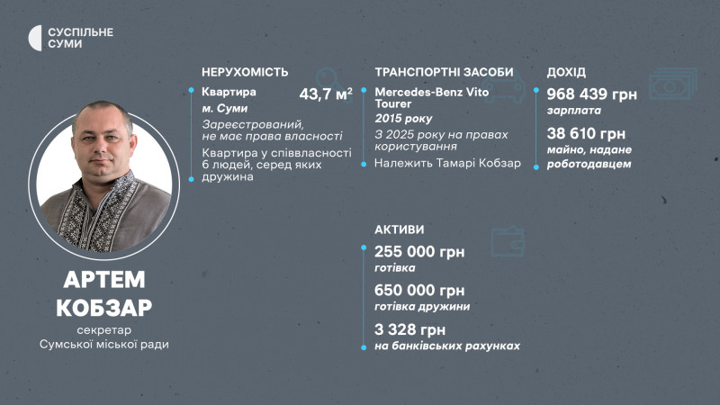 Власного житла, згідно з декларацією за 2025 рік, у секретаря міськради немає. Він живе та зареєстрований у сумській кватирі, що частково належить його дружині (14,28%) та ще п'ятьом людям.