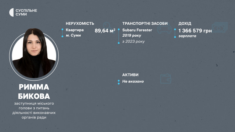 Римма Бикова має квартиру в Сумах та Subaru Forester 2019. Авто придбала у 2023 році за 642 тис. грн. Також заступниця міського голови вказала в декларації нерухомість матері в тимчасово окупованому Старобільську на Луганщині. Будинок розташований на комунальній земельній ділянці.