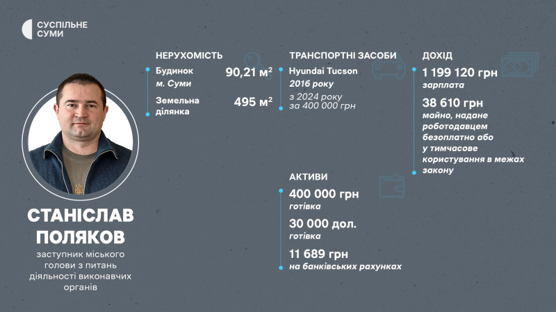 Станіслав Поляков вказав у декларації майже 1,2 млн грн заробітної плати та ще 38,6 тис. грн "майна, наданого виконкомом Сумської міськради безоплатно або у тимчасове користування". У 2025 році у посадовця були 400 тис. грн та 30 тис. дол. готівкою. Ще майже 11,7 тис. грн — на банківських рахунках.