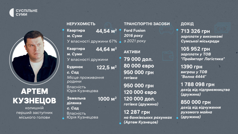 За минулий рік експосадовець задекларував дві квартири дружини в Сумах: одна у повній власності, інша — 67%. Жила родина в будинку Юрія Кузнецова в селі Сад. Їздив Артем Кузнецов на Ford Fusion 2016 (з 2021 року).