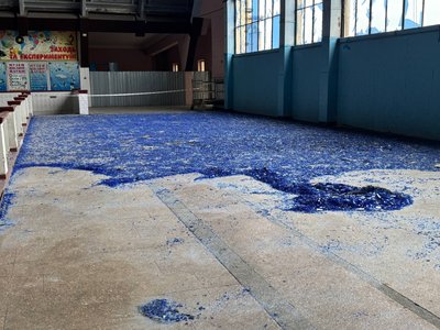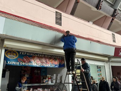 Другий поверх ринку зі сторони фасаду тимчасово огороджений, там прибирають вибите скло від вибухової хвилі. Суспільне Дніпро