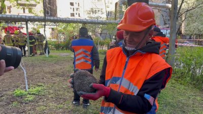 Також поруч з місцем удару комунальники врятували їжака. Тварину витягнули з купи уламків скла та бетону.