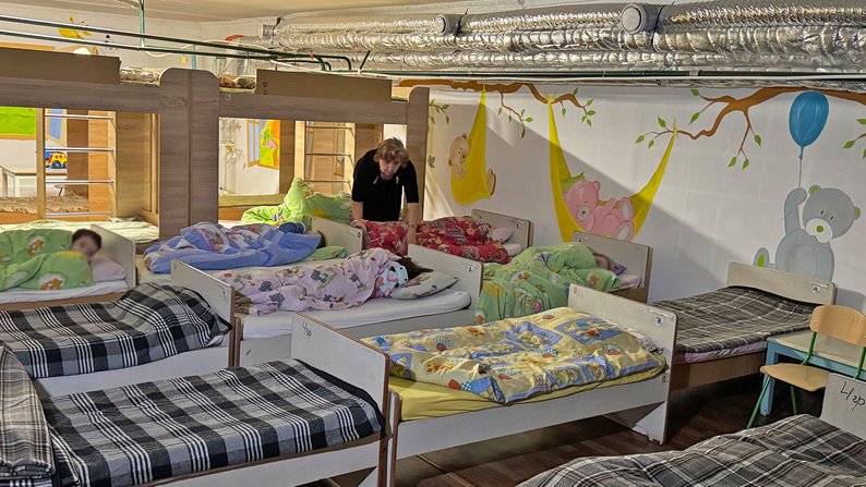 Під час повітряної тривоги вихованці та працівник Центру спускаються в укриття. Для дітей там встановили ліжка.